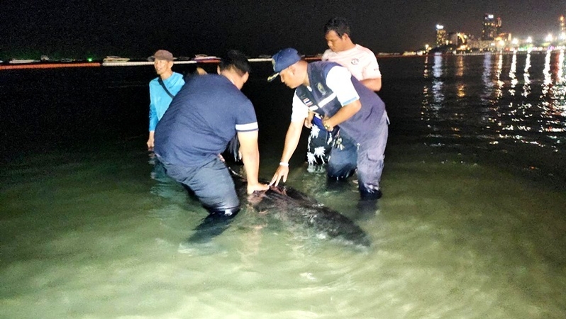 Just after midnight, aided by Sattahip Naval Force personnel, the team managed with a struggle to hoist the heavyweight mammal onto a truck that could park no nearer than 100 metres away.