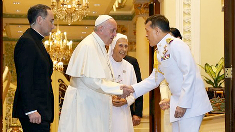 At 5.05pm on Thursday November 21, Their Majesties King Maha Vajiralongkorn and Queen Suthida welcomed His Holiness Pope Francis, head of the Roman Catholic Church, at Amphorn Sathan Residential Hall, Dusit Palace in Bangkok.