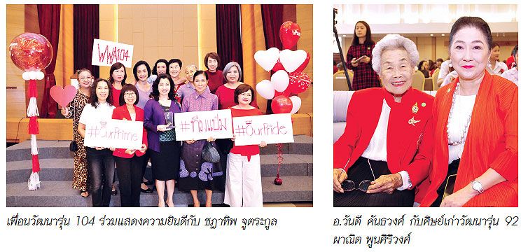 ดร.คุณหญิงกษมา วรวรรณ ณ อยุธยา ถ่ายภาพกับผู้ที่ได้รับรางวัลศิษย์เกียรติยศ ภาดาท์ วรกานนท์ ศิษย์วัฒนารุ่น 119, ดร.ณ ฤดี เคียงศิริศิษย์วัฒนารุ่น 101, ชฎาทิพ จูตระกูล ศิษย์วัฒนารุ่น 104, ยศวดี ณ นคร ศิษย์วัฒนารุ่น 108 โดยมี ลิสา นะวงศ์ นายกสมาคมศิษย์วังหลัง-วัฒนา, ดร.สิริลักษณ์ เฟื่องกาญจน์ ผจก.-ผอ.โรงเรียนวัฒนาวิทยาลัย และ ชลลกา เก่งระดมยิง อดีตนายกสมาคมศิษย์วังหลัง-วัฒนา ร่วมแสดงความยินดี