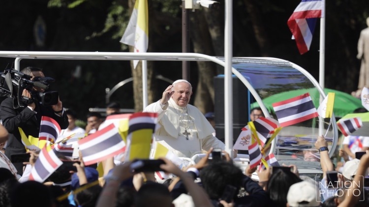 His Holiness Pope Francis waves to catholics from his popemobile on the way to Saint Peter’s church in Sam Phran District, Nakhon Pathom, today (November 22).