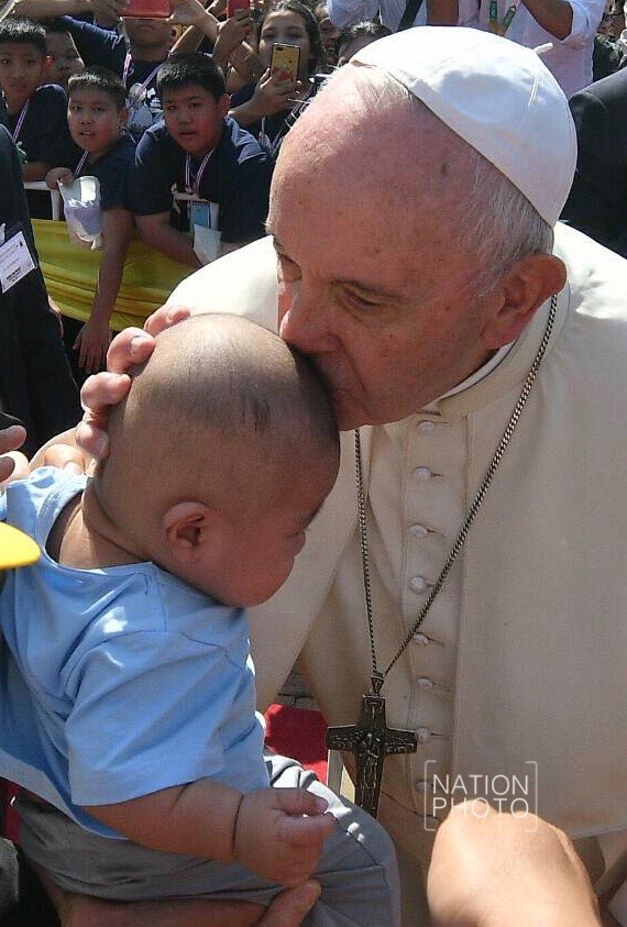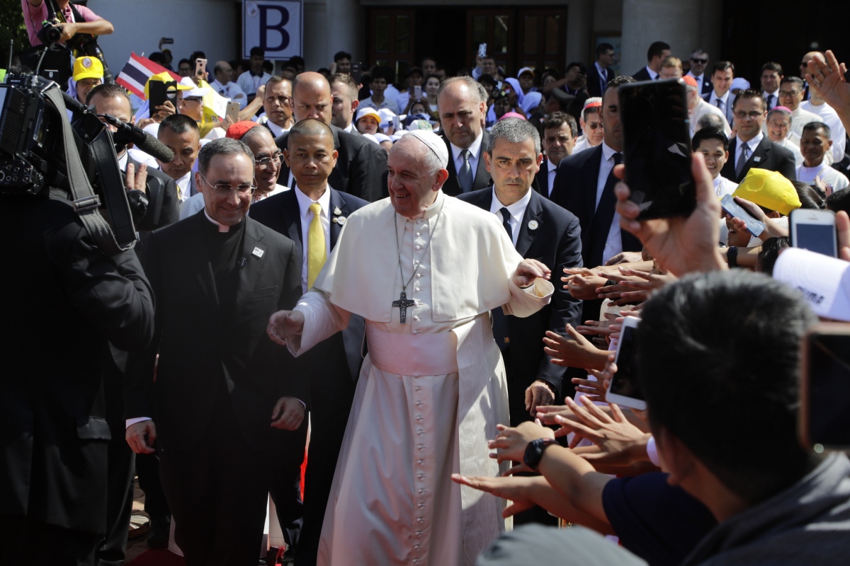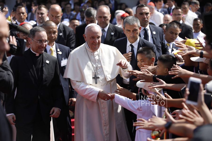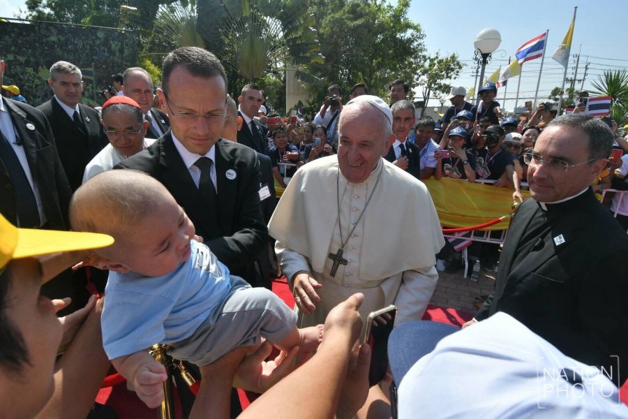 His Holiness Pope Francis waves to catholics from his popemobile on the way to Saint Peter’s church in Sam Phran District, Nakhon Pathom, today (November 22).