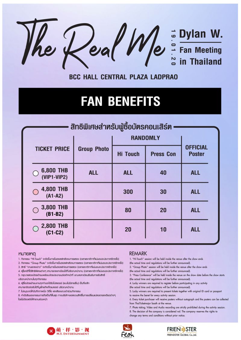 ไม่ปล่อยให้ต้องรออีกต่อไป เมื่อผู้จัดงานดีฝีมือเยี่ยมอย่าง บริษัท เฟโอห์ จำกัด (Feoh.Co.Ltd) ทุ่มทุนคืนความสุขให้กับแฟนๆชาวไทยตั้งแต่ช่วงต้นปีด้วยการล็อคคิวหนุ่มฮอตดีกรีสามีแห่งเอเชีย ดีแลน หวัง (Dylan Wang) หรือหวังเฮ่อตี้ พระเอกหนุ่มลุคแบดบอยที่สาวๆรู้จักกันดีในชื่อของ “เต้าหมิงซื่อ” จากซีรี่ย์ชื่อดังอย่าง F4 (2018) หรือ รักใสๆหัวใจสี่ดวง(2018)ที่โด่งดังในหลายๆประเทศรวมถึงที่ประเทศไทย เพื่อให้แฟนๆได้ใกล้ชิดและล้วงลึกถึงมุมมองและตัวตนของหนุ่มดีแลน กับงานแฟนมีตติ้งเดี่ยวครั้งแรกในประเทศไทย “The Real Me Dylan Wang Fan Meeting in Thailand 2020” ในวันอาทิตย์ ที่ 19 มกราคม 2020 ณ BCC HALL CENTRAL PLAZA LADPRAO