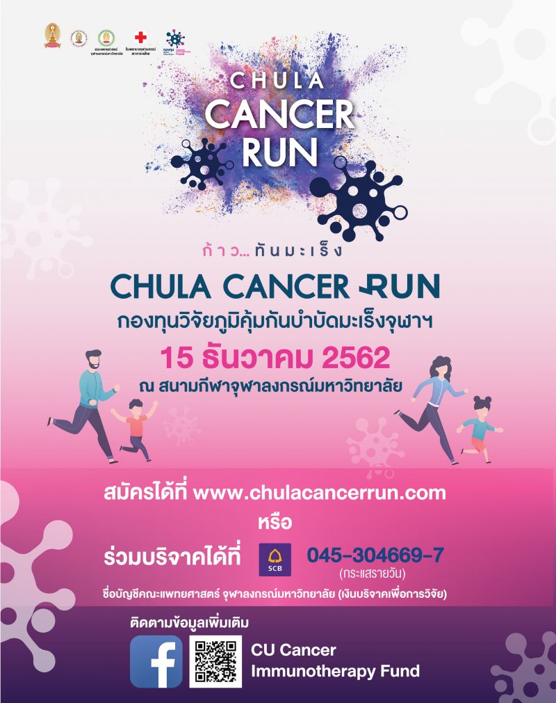 เป็นอีกครั้งที่ชาวไทยจะได้ร่วมแรงร่วมใจ เดิน-วิ่งการกุศล เพื่อสู้มะเร็งด้วยกันในงานCHULA CANCER RUN ก้าว…ทันมะเร็งในวันอาทิตย์ที่ 15 ธันวาคม 2562 ณ สนามกีฬาจุฬาลงกรณ์มหาวิทยาลัย โดยได้ศิษย์เก่าคนดังอย่าง ตูน บอดี้สแลม จากมูลนิธิก้าวคนละก้าว มาร่วมวิ่ง 10.2 กม. ด้วย