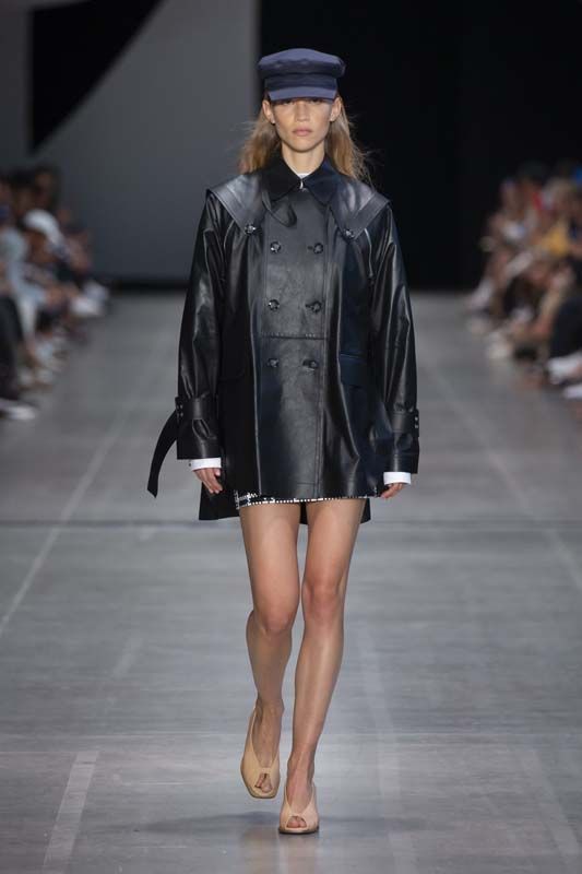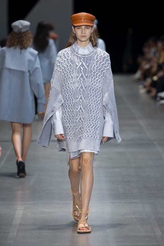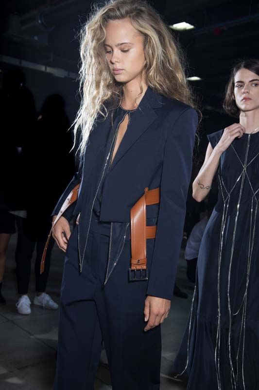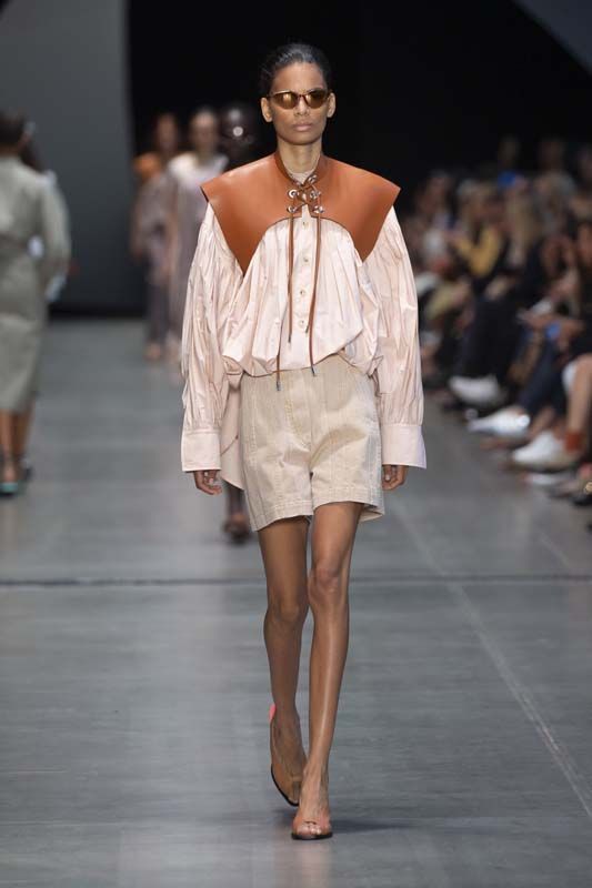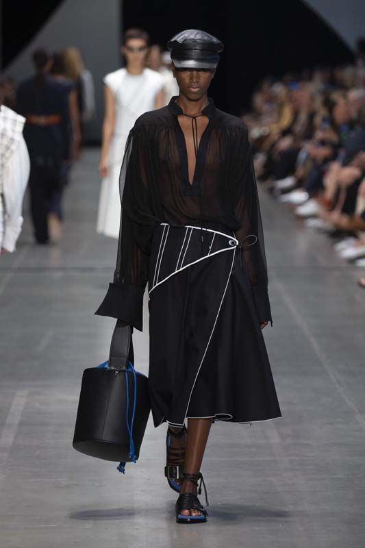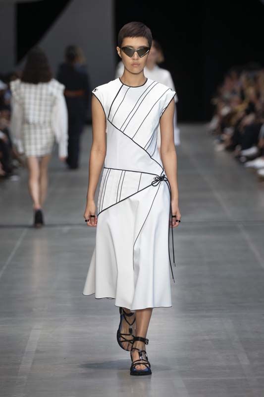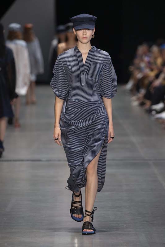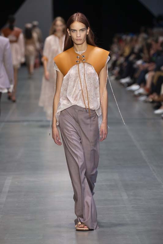ผ้าฝ้ายลายทาง,วัสดุยาง หนัง และผ้าไหม georgette รวมถึงการเล่นเลเยอร์ของวัสดุที่แตกต่างกัน อย่างการนำวัสดุหนังมารวมกับชุดเดรสที่ดูพลิ้วไหว และดีเทลบริเวณคอและแขนเสื้อสำหรับเสื้อเชิ้ตสีอ่อน นอกจากนี้ยังได้นำผ้าหนังทอลายสก็อตที่ดูซับซ้อนมาดีไซน์ไว้บนกระโปรงและเสื้อกั๊ก รวมถึงการตกแต่งด้วยพู่ห้อยและวัสดุหนัง นำมาปะติดปะต่อกันบนผ้า
