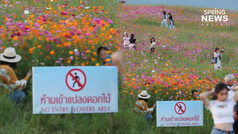 Netizens slammed tourists visiting Farm Festival on The Hill 2019 in Chiang Rai province after a photo uploaded online showed many of them ignoring warning signs and stepping on a flower bed.