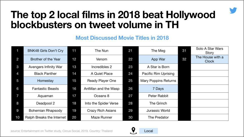 Amongst the top most-talked about local films in 2018 were “BNK48 Girls Don’t Cry” and “Brother of the Year”, both of which generated even more conversations than Hollywood blockbusters “Avengers: Infinity War” and “Black Panther”. Local films also tend to be talked about more positively than international films.