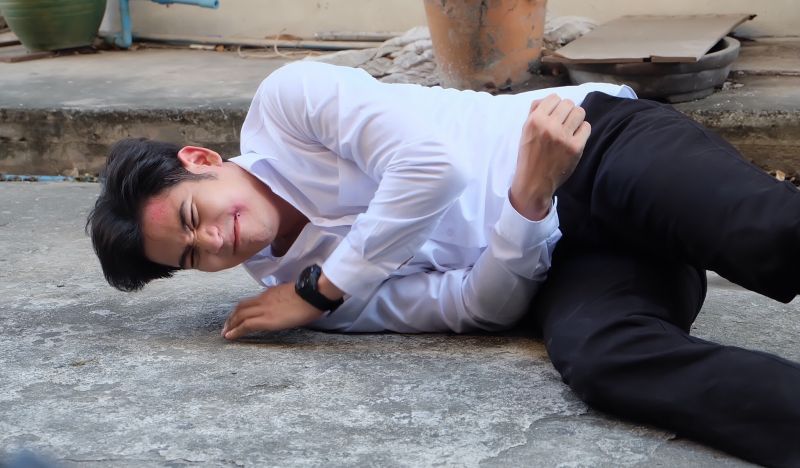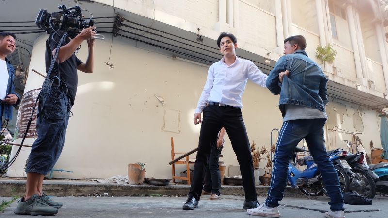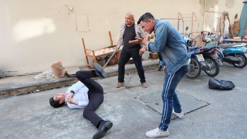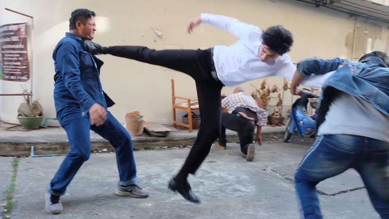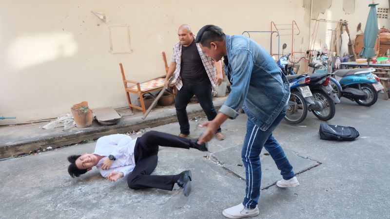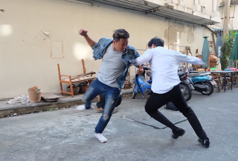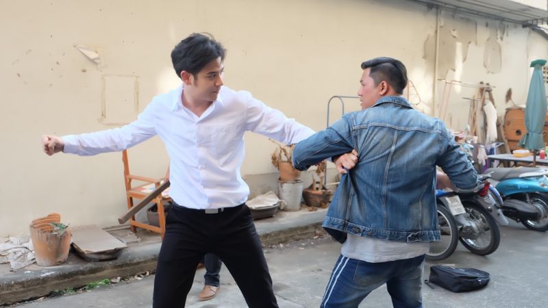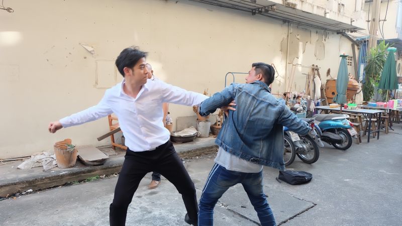 เบื้องหลังการถ่ายทำฉากนี้ พอร์ชไม่อิดออดพร้อมเข้าฉากบู๊จัดเต็ม ก่อนถ่ายทำ พอร์ชซักซ้อมท่าทางกับทีมบู๊อย่างตั้งใจ เพราะการเล่นฉากบู๊โอกาสผิดพลาดแล้วจะทำให้เจ็บตัวเกิดขึ้นได้เสมอ ดังนั้นการซ้อมและจำคิวถ่ายให้แม่นยำ จึงเป็นเรื่องสำคัญ สำหรับคิวบู๊ที่ ปัญญา ชุ่มฤทธิ์ ผู้กำกับฯ จัดมาก็ไม่ธรรมดาซะด้วยเพราะนอกจากจะมีทั้ง หมัด เข่า ศอกแล้ว ยังมีท่ากระโดดเตะตัวลอย บอกเลยว่ากว่าจะได้ภาพที่สวยงามสมใจผู้กำกับ พระเอกของเราก็เหงื่อท่วมซ้า..