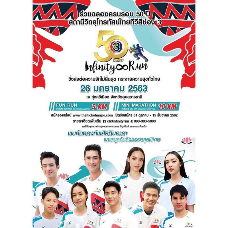 พีค..! พีค..! พีค..! ใกล้ถึงจุดพีค..!! กับงานวิ่ง “50th CH3Charity Infinity Run วิ่งส่งต่อความรักไม่สิ้นสุดกระจายความสุขทั่วไทย” มาร่วมสมัครวิ่ง..! เพื่อสุขภาพและการกุศล ไปพร้อมกับเหล่าศิลปินนักแสดงจากช่อง 3 ทั้ง 5 จังหวัด 5 ภูมิภาค ได้แก่ ภาคตะวันออก จังหวัดจันทบุรีจันทบุรี วันที่ 19 มกราคม 2563, ภาคตะวันออกเฉียงเหนือ จังหวัดอุบลราชธานี วันที่ 26 มกราคม 2563, ภาคเหนือ จังหวัดเชียงราย วันที่ 9 กุมภาพันธ์ 2563, ภาคใต้ จังหวัดตรัง วันที่ 16 กุมภาพันธ์ 2563 และภาคกลาง จังหวัดสุพรรณบุรี วันที่ 23 กุมภาพันธ์ 2563 ซึ่งในเวลานี้ทั้ง 5 จังหวัด กำลังฮอต..!! เต็มที่ กับการตอบรับที่ดีจากประชาชนนักวิ่งทั่วประเทศ สำหรับรายได้จากการสมัครวิ่ง ร่วมสมทบทุนมอบให้กับสภากาชาดในแต่ละจังหวัด รวมถึงมูลนิธิเพื่อการกุศลอีกถึง 5 มูลนิธิ ได้แก่ มูลนิธิเด็กโรคหัวใจในพระอุปถัมภ์ของสมเด็จพระเจ้าพี่นางเธอเจ้าฟ้ากัลยาณิวัฒนา กรมหลวงนราธิวาสราชนครินทร์, มูลนิธิอนุเคราะห์คนหูหนวกในพระบรมราชินูปถัมภ์, มูลนิธิช่วยคนตาบอดแห่งประเทศไทยในพระบรมราชินูปถัมภ์, มูลนิธิสร้างรอยยิ้ม ประเทศไทย และ มูลนิธิออทิสติกไทย ไม่ว่าจะเลือกวิ่งที่จังหวัดไหน ก็ได้ทำบุญสร้างกุศลร่วมกันทุกจังหวัด