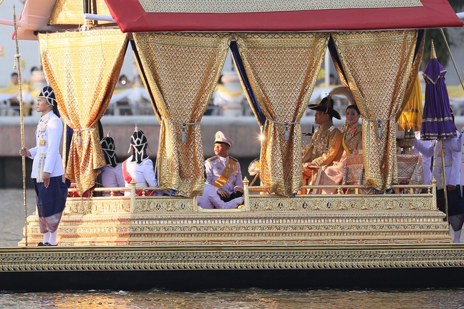 His Majesty King Maha Vajiralongkorn Phra Vajiraklaochaoyuhua, Her Majesty Queen Suthida Bajrasudhabimalalakshana, and His Royal Highness Prince Dipangkorn Rasmijoti entered the royal barge Suphannahong, which was manned by 50 oarsmen with two steersmen, two officers, one standard bearer, one signalman, seven Royal Chatra bearers and one chanter to sing the traditional boat song with the oarsmen chanting in unison.