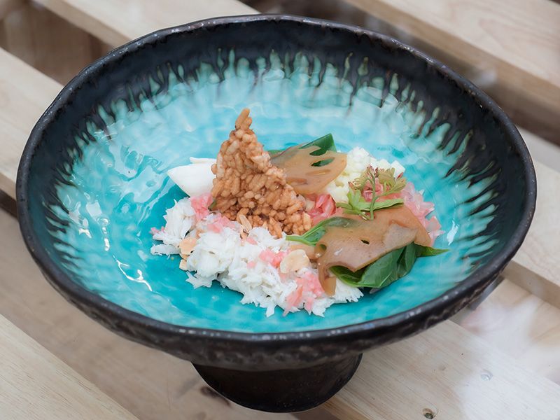 ปูม้าที่เชฟแบล็คนำมาเสิร์ฟในเมนูนี้ เป็นปูจากธนาคารปูที่เพาะพันธุ์เพื่อฟื้นฟู และอนุรักษ์ทรัพยากรปู จากชุมชนหมู่บ้านหินกบ จังหวัดชุมพร เสิร์ฟพร้อมกับมันปูนา (อ่องปู) จากนาที่ชุมชนบ้านแม่ทา จังหวัดเชียงใหม่ ปูนาจะมีมากในช่วงฤดูฝนและฤดูหนาว เมื่อนำมาประกอบอาหารจะให้ความหอม มัน อร่อยกลมกล่อมทานคู่กับผลไม้ประจำฤดูกาล เป็นอีกหนึ่งเมนูเรียกน้ำย่อยที่ช่วยเพิ่มความสดชื่นได้เป็นอย่างดี