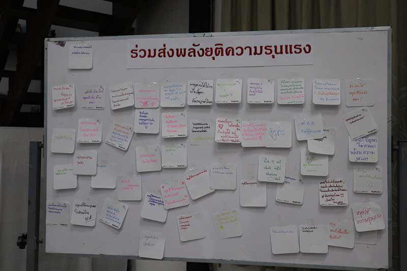 ด้านนางสาวเอ (นามสมมติ) คุณแม่ที่เคยประสบปัญหาความรุนแรงในครอบครัว กล่าวว่า ประมาณ 3-4 ปี ตั้งแต่ท้องลูกคนแรก และคนที่ 2 คลอดได้ 4 เดือน สามีก็ทำร้ายหนัก มีอาวุธ ใช้มีดตีหัว แผลเก่ายังไม่หาย คิดแค่ว่าถ้าเราตายลูกจะอยู่ยังไง เราต้องรอด เขากีดกันไม่ให้เจอลูก จนต้องขอความช่วยเหลือจากมูลนิธิเพื่อนหญิง แล้วพาไปแจ้งแล้วตามหาลูก จนได้ลูกกลับมา ตนและลูกจึงไปอาศัยที่บ้านพักฉุกเฉิน เป็นครั้งแรกในรอบ 7 เดือนที่ได้เลี้ยงลูกเอง มาอยู่ที่นี่ได้ฟื้นฟูจิตใจ แรกๆเห็นอะไรก็ร้องไห้ ทำไมชีวิตต้องมาเจออะไรแบบนี้ ตนได้เข้าร่วมกลุ่มโรงเรียนธัมใจ(Group Support) โดยบ้านพักฉุกเฉินและมูลนิธิส่งเสริมความเสมอภาคทางสังคมจัดขึ้น ทุกเดือนๆละ1ครั้ง ทำให้จิตใจดีขึ้น คือเริ่มทิ้งเรื่องเก่า เออ ช่างมัน ไม่ฟ้อง ไม่ได้กีดกันพ่อเพื่อมาเจอลูกด้วยได้ตามปกติ ตั้งหน้าตั้งตาทำวันนี้ให้ดี เพื่ออนาคตของลูก หนูอยู่บ้านพักฯ ทำกิจกรรม ทำดอกไม้ประดิษฐ์และได้ช่วยเหลือเพื่อนสมาชิกคนอื่นๆ