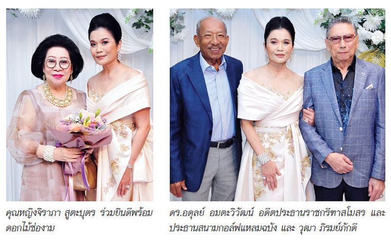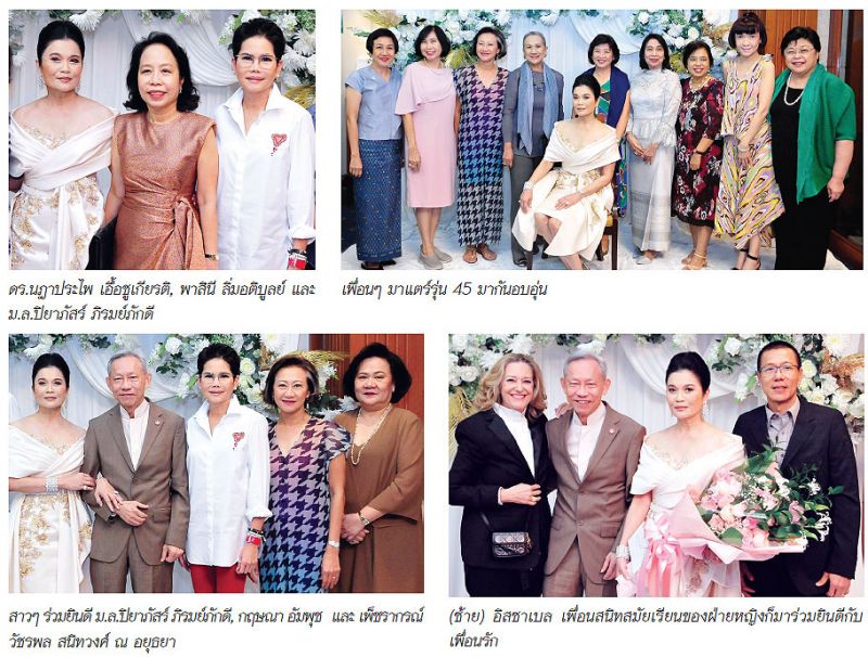 บรรยากาศภายในงานฉลองสังสรรค์แบบสบายๆ เป็นกันเอง นอกจากคุณพ่อ-คุณแม่ฝ่ายหญิง อดีตเอกอัครราชทูตไทยในหลายประเทศ ศ.ดร.สมปอง-ถ่ายเถา สุจริตกุล คุณแม่นักประพันธ์นวนิยายชื่อดังอย่าง มงกุฎดอกส้ม และดอกส้มสีทอง จะมาร่วมแสดงความยินดีกับลูกสาวแล้ว ยังมีแขกผู้ใหญ่ที่เจ้าภาพเคารพนับถือกล่าวอวยพรมอบให้ โดยเริ่มที่คุณหญิงหนู-คุณหญิงจิราภา สูตะบุตร กล่าวว่า รักกี้เหมือนลูกสาว ดูแลและให้กำลังใจมาโดยตลอด สำหรับ เจ้าบ่าว-ยศ เป็นคนดีที่กี้จะฝากชีวิตได้ ทั้งสองเป็นคู่ที่ฟ้าลิขิตแล้วคู่กันแล้วยังไงก็ไม่แคล้วกัน พล.อ.มงคล อัมพรพิสิฏฐ์ อดีต ผบ.สส. กล่าวว่า “มั่นใจว่าคู่นี้จะอยู่ด้วยกันอย่างมีความสุขช่วยกันดูแลซึ่งกันและกัน เพราะอยู่ด้วยกันมาถึง 28 ปีแล้ว ขอให้ครองคู่ถึง 48 ปี และเชิญผมมาเป็นพยานอีกครั้ง” วุฒา ภิรมย์ภักดี ประธานกรรมการบริหาร บริษัท บุญรอดบริวเวอรี่ จำกัด กล่าวสั้นๆ ว่า “ไม่น่าเชื่อว่าครองคู่อยู่กันมา28 ปี ก็ขอให้ทั้งสองอยู่ด้วยกันอย่างมีความสุขตลอดไป”ปิดท้ายที่ จุฑา วิวรกิจ เป็นผู้แทนเพื่อนจากมาแตร์เดอีตั้งแต่เรียนอนุบาล กล่าวชื่นชมเพื่อนว่าเป็นผู้มีความสามารถหลากหลาย มีไหวพริบดี เรียนเก่ง การบ้านการเรือนดี รำไทย และร้องเพลงก็เก่ง มีครอบครัวที่น่ารักอบอุ่น ขอแสดงความยินดีในวันพิเศษในวันนี้ เห็นความสุขในแววตาของคุณยศ-กี้ส่องประกายซึ่งกันและกัน ขอให้มีความสุขตลอดไป รักกันตราบชั่วนิรันดร์”