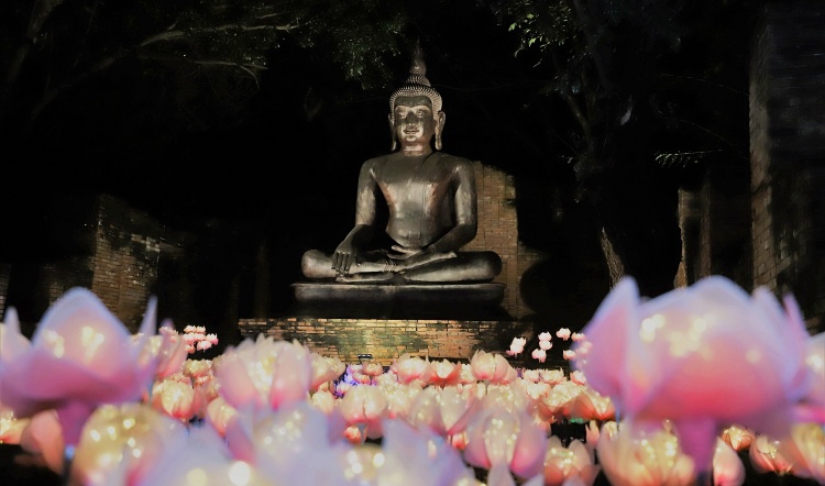 4 Na Suthapathima, the exhibition of the three Buddha sculptures, each of which will be displayed separately. The first Buddha image is decorated with lights in a beautiful pink lotus blossomed in front of the Buddha image. The other Buddha statues have spherical lights of various colours including yellow, orange, golden, and blue.