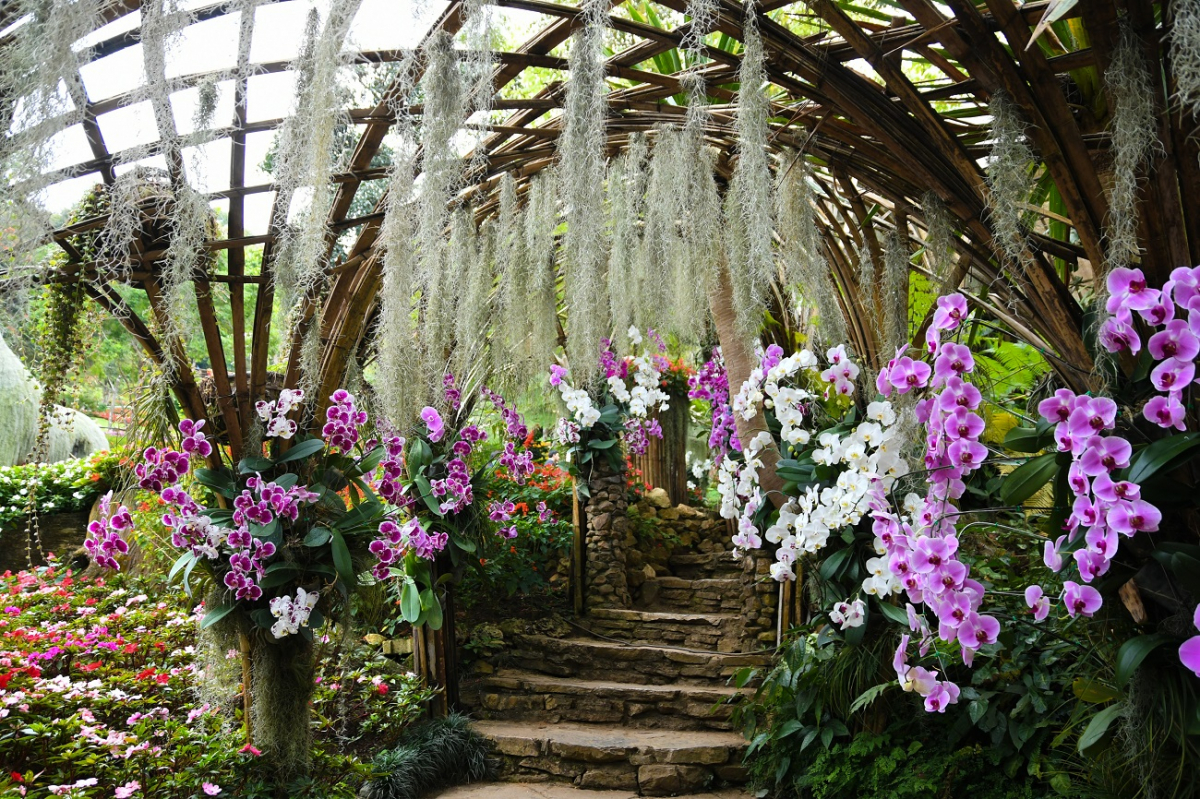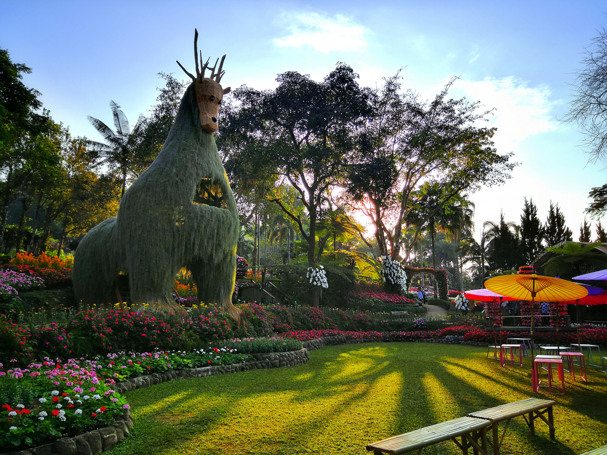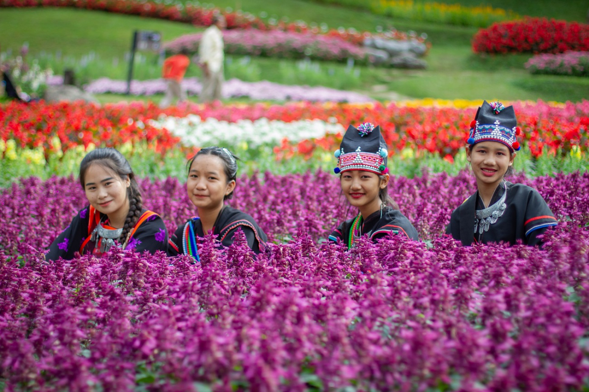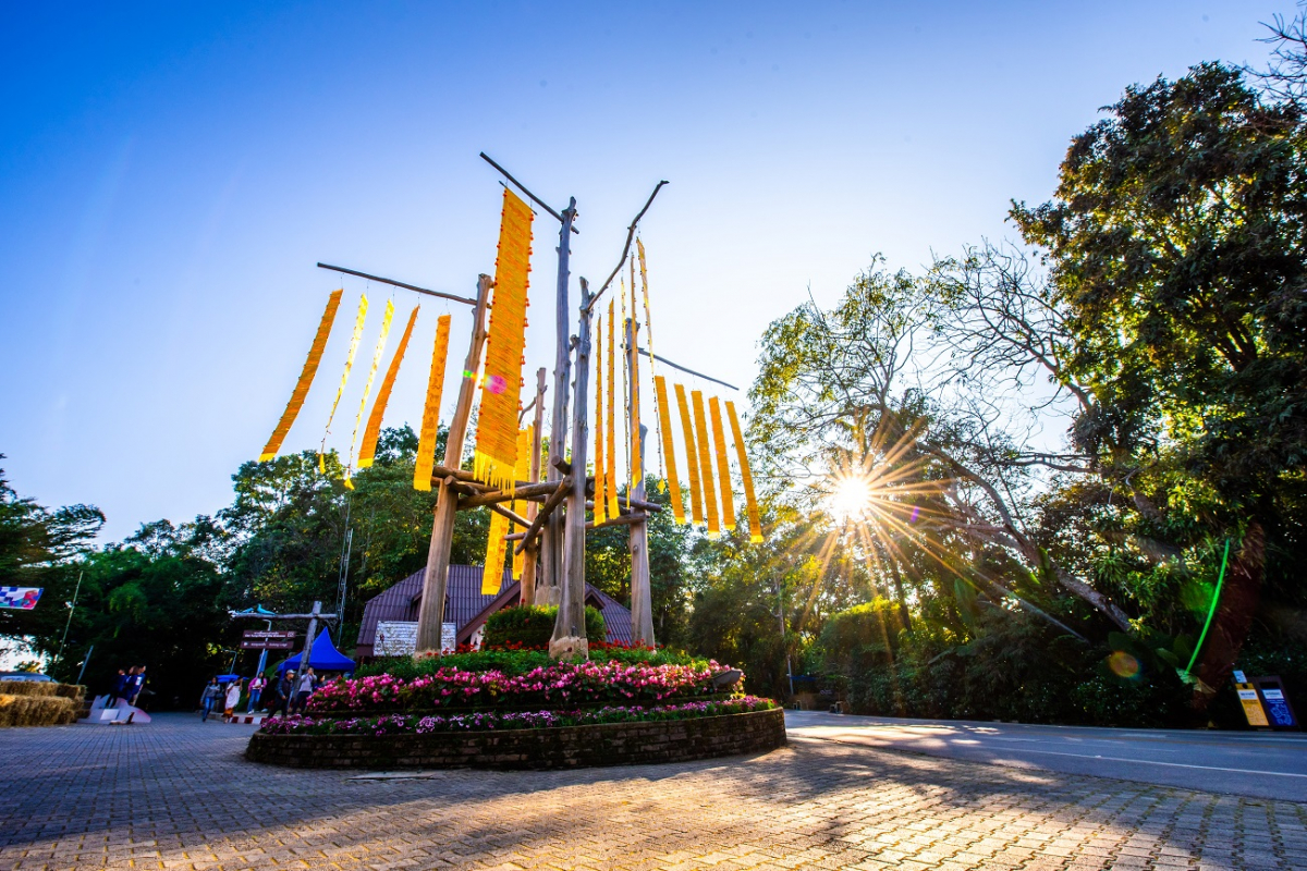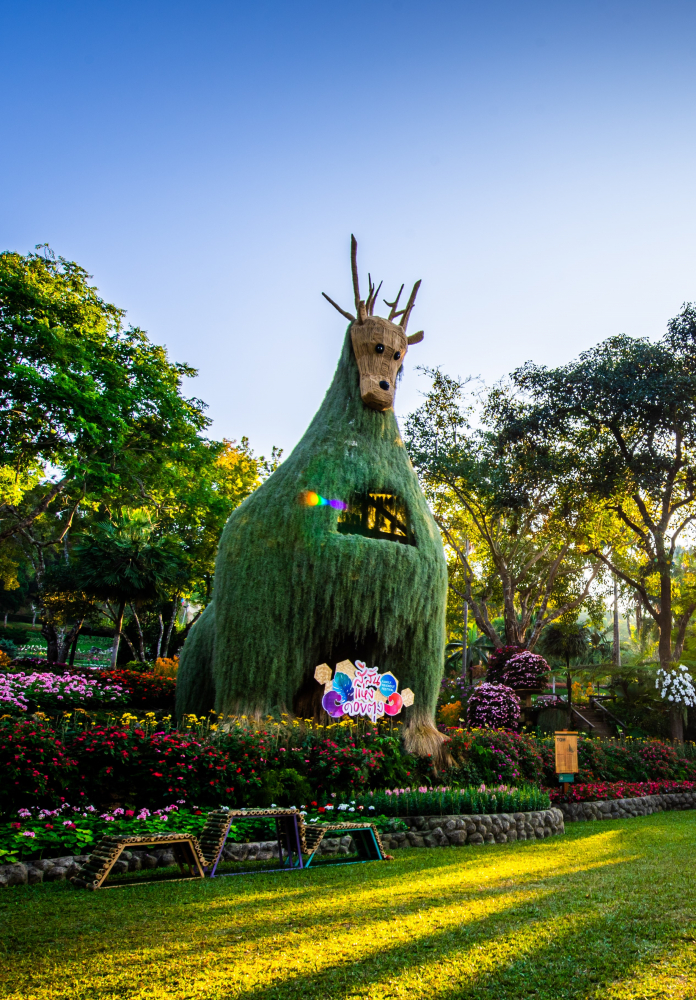 As ever, the gardens are ablaze with such winter flowers as geraniums and orchids, many of them arranged into the fabric pattern of the 6 tribes. A giant mascot, the legendary lucky animal of the hill people designed by Loley – Thaweesak Srithongdee and standing 9 metres tall, is on hand to greet visitors, who can take a break and relax in the giant bird’s nest and a giant seashell seat.
