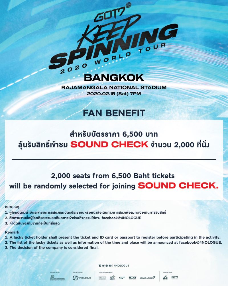 GOT7 2020 WORLD TOUR ‘KEEP SPINNING’ IN BANGKOKคือคอนเสิร์ตที่ยิ่งใหญ่ที่สุดของ GOT7 จะมาพร้อมรูปแบบเวทีที่ออกแบบมาเพื่อให้หนุ่มๆ ได้ชิดอากาเซที่สุดด้วยแคทวอร์คยาว 349 เมตร ซึ่งยาวที่สุดในประวัติศาสตร์ที่เคยทำมา โปรดักชั่นจัดเต็ม แสง เสียง และเอฟเฟคแบบอัดแน่นตามสไตล์ผู้จัดมืออาชีพอย่าง 4NOLOGUEอีกทั้งโชว์สุดพิเศษที่มีเฉพาะประเทศไทยเท่านั้นมาร่วมเป็นส่วนหนึ่งในการสร้างประวัติศาสตร์ครั้งสำคัญ ที่จะอยู่ในความทรงจำตลอดไปและร่วมพิสูจน์พลังความรักของอากาเซที่มีให้กับ GOT7 ไปด้วยกัน…