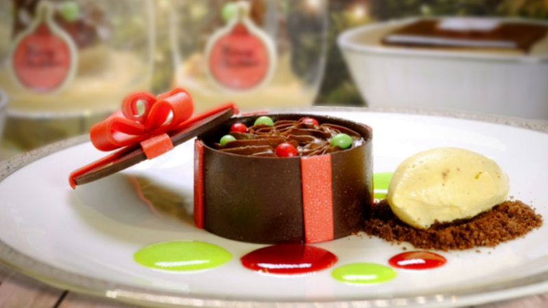 A chocolate Christmas tree will be served in Royal Silk Class and Chocolate praline cake will be served in Economy Class.