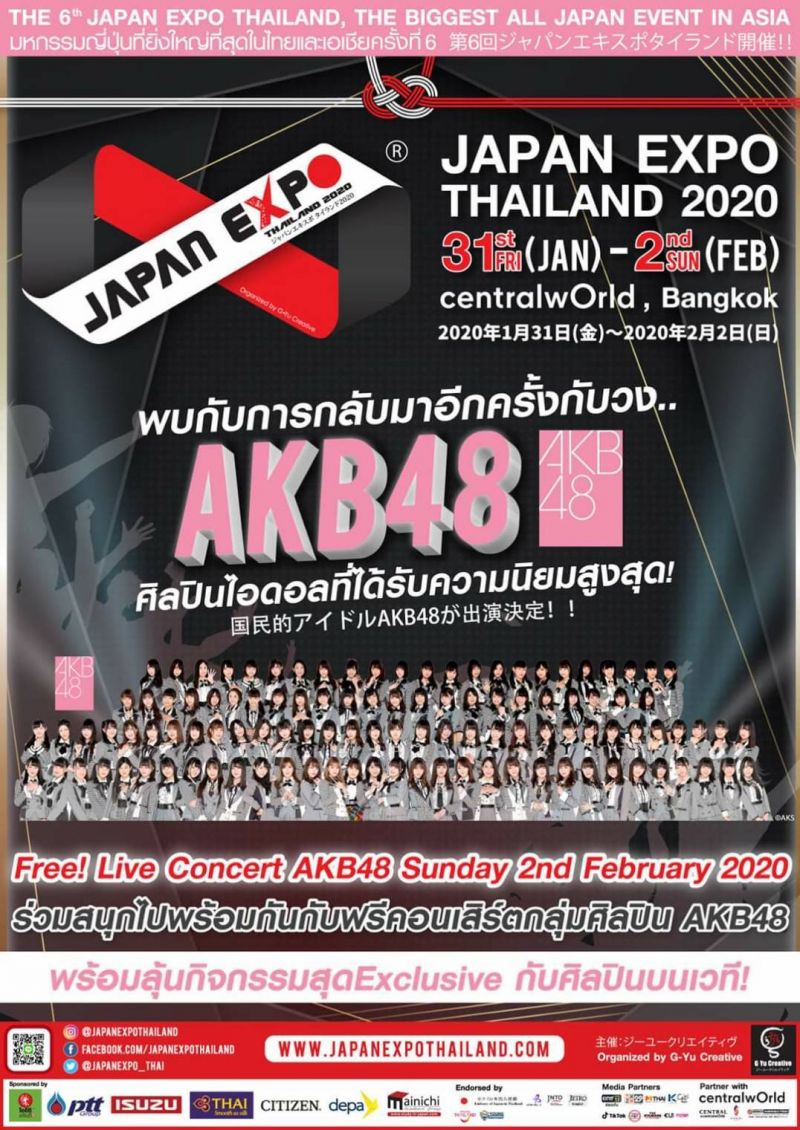 หลังจากกรี๊ดสนั่นประกาศการจะมาเยือนประเทศไทยของหนุ่มๆ Snow Manจาก Johnny & Associatesกันไปแล้ว วันนี้เหล่าแฟนๆไอดอลก็ได้กรี๊ดสนั่นก๊อกสองกับการคัมแบ๊คของไอดอลสาวทั้ง 6 จากวง AKB48 ที่ตอบรับการกลับมาเยือนเวที JAPAN EXPO THAILAND 2020 อีกครั้ง โดยกำหนดงานวันศุกร์ที่ 31 มกราคม – วันอาทิตย์ที่ 2 กุมภาพันธ์ 2563 ณ ศูนย์การค้าเซ็นทรัลเวิลด์ จากผู้จัดงานคนเก่งกูรูอีเว้นท์ญี่ปุ่นระดับเอเชีย คุณยุพเรศ เอกธุระประคัลภ์ ประธานกรรมการบริหาร บริษัท จี-ยู ครีเอทีฟ (G-Yu Creative)พร้อมด้วยผู้สนับสนุนหลักอย่างเป็นทางการจาก บริษัท โออิชิ กรุ๊ป จำกัด (มหาชน) , บริษัท ตรีเพชรอีซูซุเซลส์ จำกัด, บริษัท อิออน ธนสินทรัพย์ (ไทยแลนด์) จำกัด (มหาชน), บริษัท การบินไทย จำกัด (มหาชน), บริษัท ศรีทองพาณิชย์ จำกัดและ โรงเรียนสอนภาษาญี่ปุ่นไมนิจิ และเหล่าบรรดาพันธมิตรภาครัฐและเอกชนอีกมากมายที่ร่วมสนับสนุนงานมหกรรมญี่ปุ่นที่ยิ่งใหญ่
