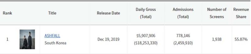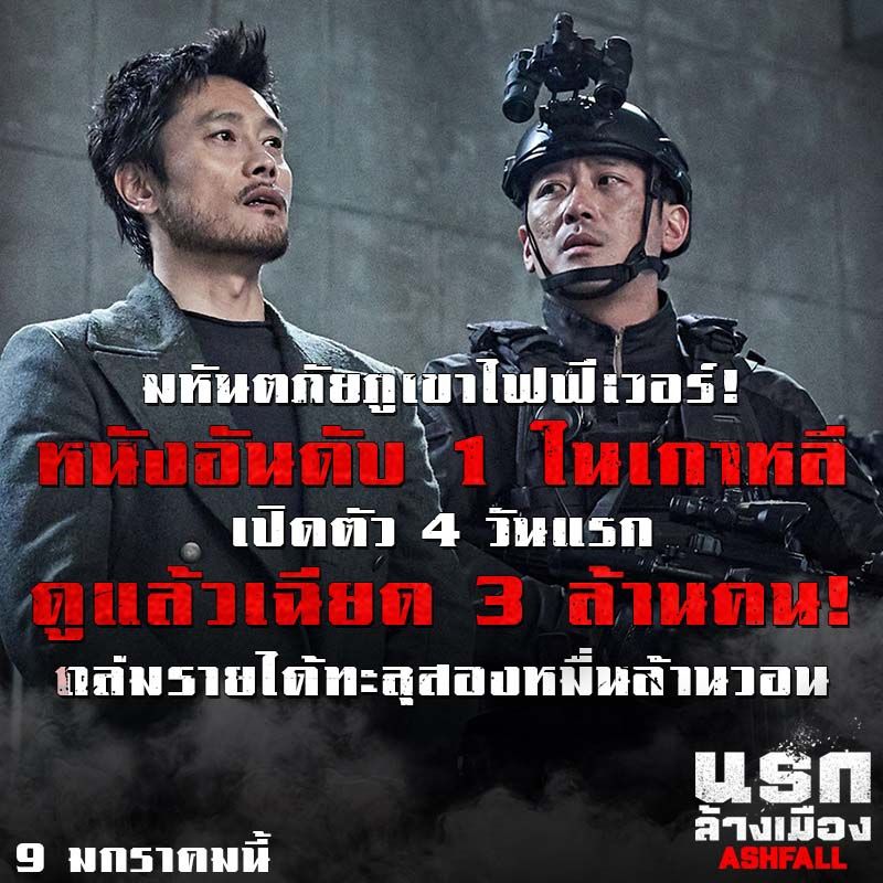 ยกตำแหน่งให้เป็นภาพยนตร์ที่มาแรงสุดๆ ในเกาหลี ณ เวลานี้จริงๆ สำหรับ “ASHFALL นรกล้างเมือง” โปรเจกต์มหันตภัยภูเขาไฟปะทุ-แอคชั่นฟอร์มยักษ์ ที่ล่าสุดได้เดินหน้าสร้างปรากฏการณ์ถล่มบ็อกซ์ออฟฟิศในประเทศเกาหลี รายได้วันต่อวัน ชั่วโมงต่อชั่วโมง ด้วยยอดผู้ชมที่แห่กันมาแบบล้นทะลักเฉียด 3 ล้านคน ภายในการเปิดตัวฉายเพียง 4 วัน (วันที่ 19 ธ.ค. – 22 ธ.ค.) และทำเงินอย่างไม่หยุดหย่อนทะลุสู่ 2 หมื่นล้านวอน (21,266,969,114 วอน หรือประมาณ 551,517,724 ล้านบาท) ถือได้ว่าเป็นผลงานระดับฮอตฟีเวอร์ตัวจริงส่งท้ายปีกันเลยทีเดียว