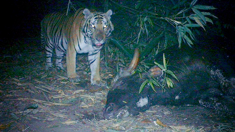 In the morning, the footage showed an image of a fully grown male tiger coming back to eat the gaur. The tiger previously lived in Huai Kha Khaeng Wildlife Sanctuary and migrated to Mae Wong National Park in 2014.