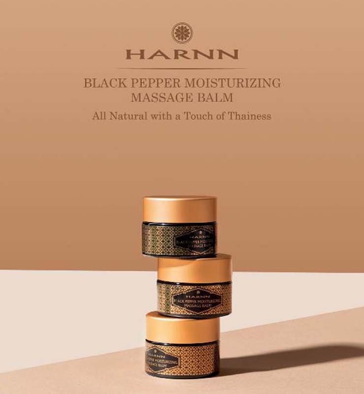 อีกทั้งยังรังสรรค์บาล์มจากคุณสมบัติอันเลอค่าจากสมุนไพรไทยอย่าง พริกไทยดำ ผสานภูมิปัญญาไทยและนวัตกรรมแบบนำสมัย ก่อให้เกิด HARNN Black Pepper Massage Blam (ขนาด 12g.) ผลิตภัณฑ์จากขี้ผึ้งธรรมชาติ ผสานน้ำมันหอมระเหยที่อุดมไปด้วย Black Pepper Oil น้ำมันจากพริกไทยดำที่อุดมไปด้วย Piperine และ Piperamine ดีต่อระบบทางเดินหายใจ ช่วยบรรเทาความเหนื่อยล้า Vitamin E จาก Rice Bran Oil น้ำมันรำข้าว อุดมไปด้วย Orizanol หนึ่งในสารต่อต้านอนุมูลอิสระที่สามารถพบได้เฉพาะในข้าว ช่วยบำรุงผิว และชะลอวงจรการเสื่อมอายุของผิวซึ่งเป็นสาเหตุของริ้วรอยและความหมองคล้ำ Organic Shea Butter ช่วยกักเก็บและป้องกันการสูญเสียความชุ่มชื้น ที่ก่อให้เกิดผิวแห้งเสียจากมลภาวะและแสงแดด ทั้งยังมีคุณสมบัติในการเยียวยา