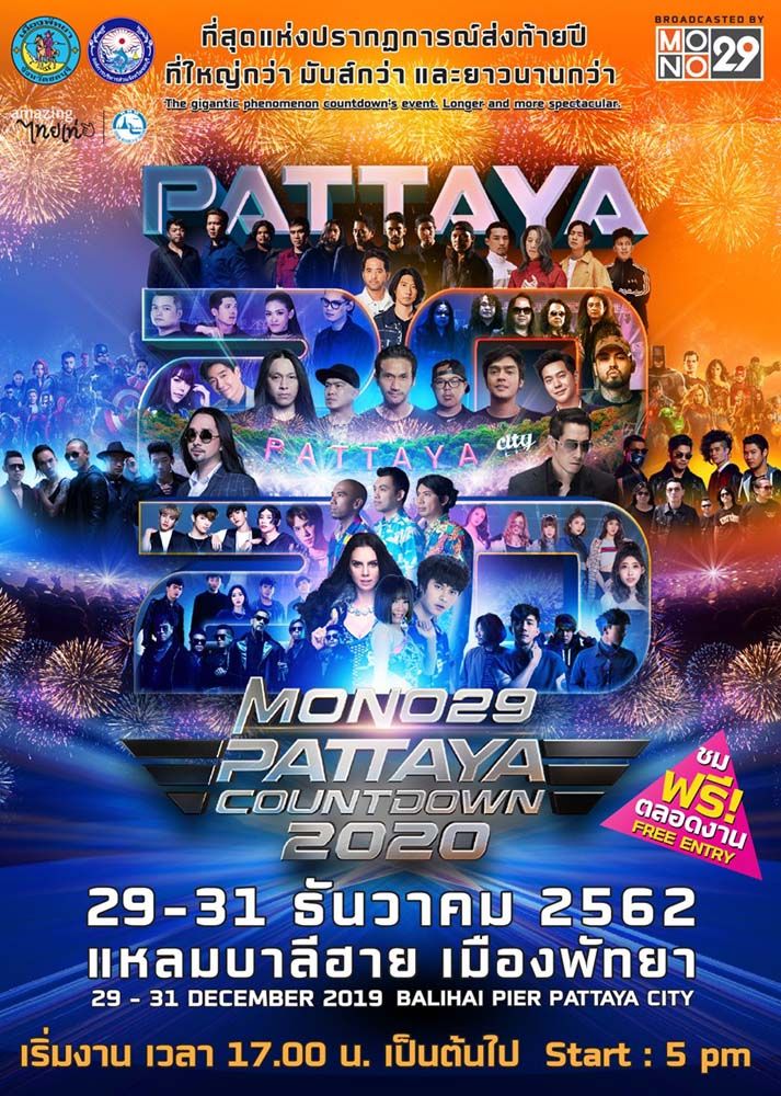 ใกล้เข้ามาทุกทีแล้วสำหรับเทศกาลแห่งความสุขเฉลิมฉลองส่งท้ายปีเก่าต้อนรับปีใหม่ โดย เมืองพัทยา, องค์การบริหารส่วนจังหวัดชลบุรี ร่วมกับ สถานีโทรทัศน์ ช่องMONO29 (โมโนทเวนตี้ไนน์) ในเครือโมโน กรุ๊ป จัดมหกรรมความบันเทิงเฉลิมฉลองใหญ่ส่งท้ายปีเก่าต้อนรับปีใหม่ในงาน“MONO29 PATTAYA COUNTDOWN 2020” (โมโน29พัทยา เคานท์ดาวน์ 2020) ที่จะมีขึ้นในวันที่ 29-31 ธันวาคม 2562 นี้ ณ ท่าเทียบเรือท่องเที่ยวเมืองพัทยา (แหลมบาลีฮาย) จังหวัดชลบุรีกับโปรดักชั่น แสง สี เสียง ตระการตา สุดยิ่งใหญ่ พร้อมทัพศิลปินสุดฮอตร่วมมอบความบันเทิง