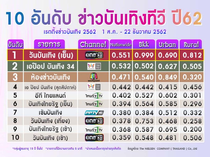 ข้อมูลรายงานความนิยมโดย The NIELSEN COMPANY ( THAILAND ) Co,.Ltd ระหว่างวันที่ 1 สิงหาคม – 22 ธันวาคม 2562 ของปีนี้ มีการจัดอันดับเฉพาะรายการที่เป็นสื่อกลางข่าวบันเทิงที่ความยาวเกิน 5 นาที โดยมีความเคลื่อนไหวดาราข้ามช่อง ไม่เน้นการโปรโมทละครและรายการเพียงอย่างเดียว ปรากฎว่ารายการ “วันบันเทิง” ในข่าวเย็นช่องวัน ครองความนิยมอันดับที่ 1 ในกลุ่มผู้ชมที่มีอายุ 15 ปีขึ้นไป นับเป็นครั้งแรกที่ความนิยมสูงเป็นอันดับที่ 1 หลังมีการปรับทัพทีมงานเบื้องหน้าและเบื้องหลัง