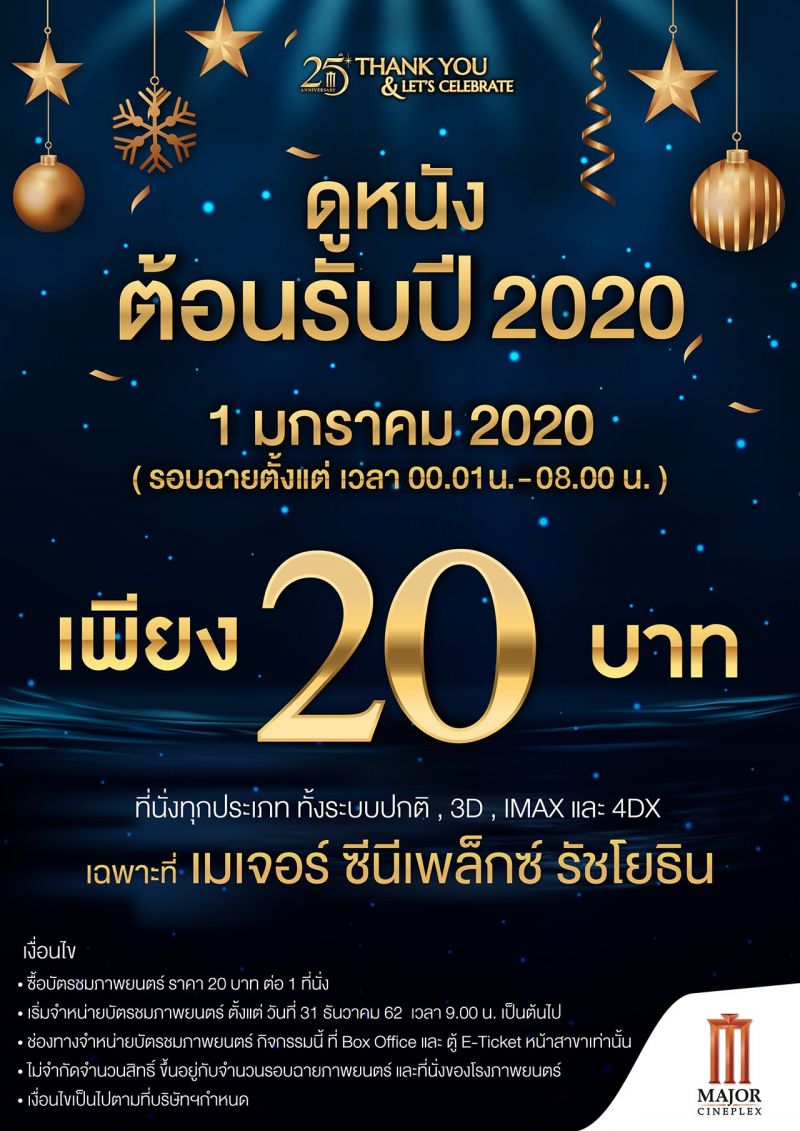 ดูหนังราคาพิเศษเพียงที่นั่งละ20 บาท ไม่จำกัดจำนวนสิทธิ์ ทุกประเภทที่นั่ง ทั้งที่นั่งพิเศษ ที่นั่งปกติ ระบบ IMAX และ 4DX สามารถซื้อบัตรชมภาพยนตร์ได้ตั้งแต่วันที่ 31ธันวาคม 2562ตั้งแต่เวลา 09.00 เป็นต้นไป ที่ จุดจำหน่ายบัตรชมภาพยนตร์ ( Box Office) และ ตู้จำหน่ายตั๋วอัตโนมัติ (E Ticket) เฉพาะที่เมเจอร์ ซีนีเพล็กซ์ รัชโยธิน เท่านั้น