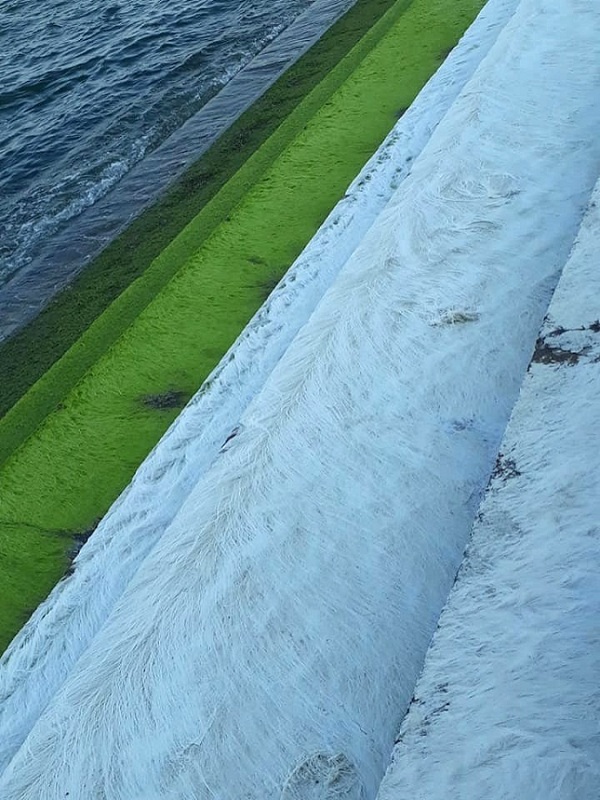 The algae (Ulva intestinalis) is edible and their appearance resembles a long stretch of cloudy fur. The growth is natural and will not harm the environment.