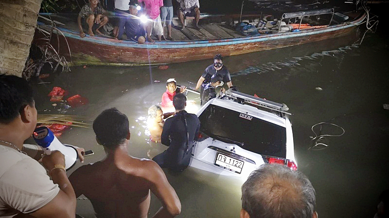 Security cameras nearby show the car travelling at high speed, then suddenly plunged into the canal. The mayor, reportedly, left Thetsaban 1 Sangkhawit School’s boy scout camp before the accident.
