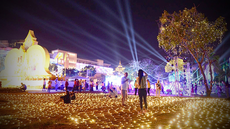 The illuminations will be on every night through December 31. More than a million sparkling lights are spread over 5 zones: Thepdanthip [God in the heaven]; Thaloengsok Amnuay Chai [blessing for the new beginning]; Chalerm Chat Sanosorn [All glory to the king]; Russamee Dara Shai [Radius of starlight]; and Pok Kset Pracha [The protector of people]; with lighting design shows in three colours of 30-minutes duration taking place at 7.30, 8.30 and 9.30 pm. Visitors can also feast on food and drinks and shop for DIY products and hand-made items.