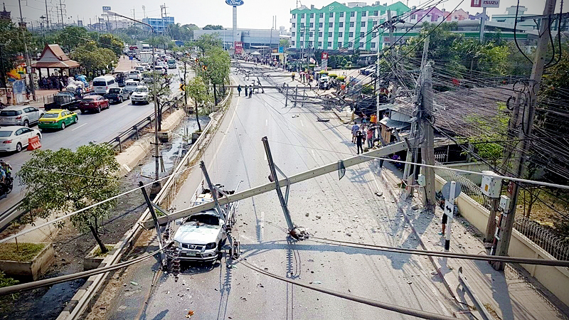 Seven people were injured and eight cars damaged when a pickup truck crashed into an electricity post and pulled down 14 other posts in Samut Prakan province.