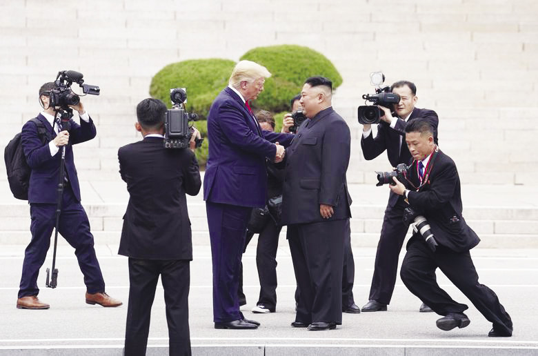 ประวัติศาสตร์ : อีกหนึ่งภาพเหตุการณ์ประวัติศาสตร์ เมื่อประธานาธิบดีโดนัลด์ ทรัมป์ ผู้นำสหรัฐ จับมือกับ นายคิม จอง อึน ผู้นำสูงสุดของเกาหลีเหนือ ที่เขตปลอดทหารบริเวณพรมแดนระหว่างเกาหลีเหนือและเกาหลีใต้ในหมู่บ้านปันมูนจอม เมื่อเดือนมิถุนายน