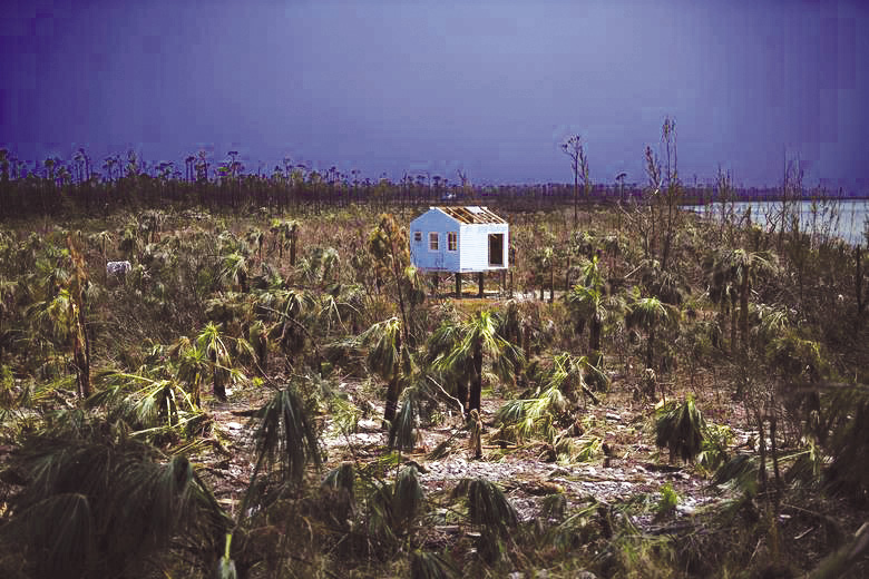 โดดเดี่ยว : บ้านหลังเดียวที่ตั้งอยู่กลางทุ่งริมชายฝั่ง เสียหายยับเยินท่ามกลางต้นไม้พังราบ จากอิทธิพลของพายุเฮอริเคนดอเรียน ที่เกาะเกรท อบาโก ของเครือรัฐบาฮามาส