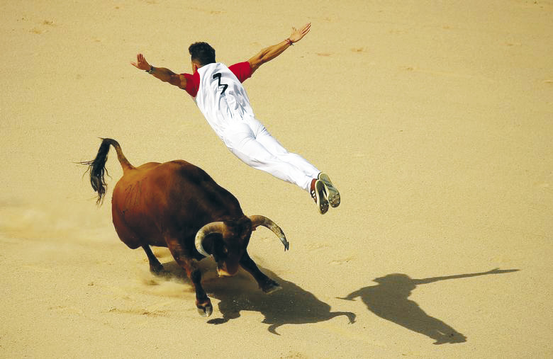 ท้าสู้วัว : พนักงานล่อวัวกระทิงโชว์ลีลาเหินหาวกระโดดลอยตัวข้ามวัวกระทิง ระหว่างการเผชิญหน้าในสนามสู้