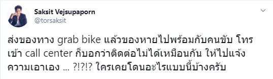 2 มกราคม 2563 จากกรณี โต๋ ศักดิ์สิทธิ์ เวชสุภาพร จ้าง Grab Bike ส่ง MacBook Air แต่ของได้หายไปพร้อมกับคนขับ ซึ่งเจ้าตัวโทรเข้า call center ก็บอกว่าติดต่อไม่ได้เหมือนกัน ให้ไปแจ้งความเอาเอง จนหนุ่มโต๋ต้องออกมาทวิตข้อความถึงเรื่องดังกล่าว ทำให้มีเพื่อนๆ และแฟนคลับเข้ามาคอมเม้นท์วิจารณ์จำนวนมากนั้น