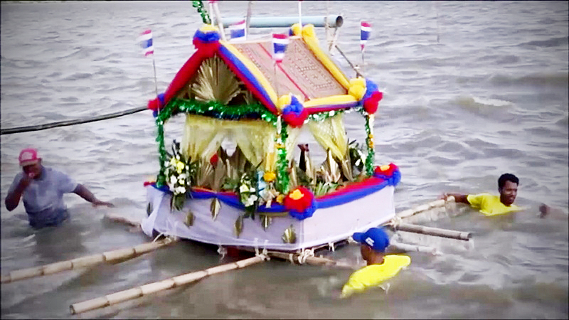 The raft – filled with belongings, incense, candles and flowers symbolising people’s suffering and sickness – is then floated on Songkhla Lake.