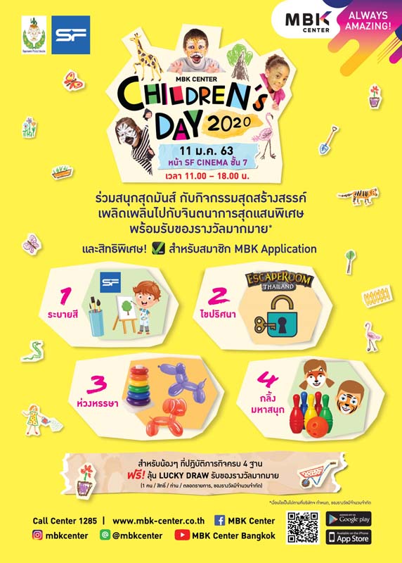 ศูนย์การค้าเอ็มบีเค เซ็นเตอร์ จัดงาน “MBK Center Children’s Day 2020” ภายในงานพบกับกิจกรรมแสนสนุกสุขหรรษา เพิ่มทักษะการตัดสินใจผ่านการคิดวิเคราะห์ ต่อยอดจินตนาการและความคิดสร้างสรรค์ ส่งเสริมพัฒนาการด้านร่างกาย สติปัญญา อารมณ์และจิตใจ ในรูปแบบของการเล่นเกมส์ตามฐานต่าง ๆ อาทิ ฐานระบายสี ฐานไขปริศนา ฐานห่วงหรรษา ฐานกลิ้งมหาสนุก เป็นต้น ซึ่งหากน้องๆ ปฏิบัติภารกิจครบทั้ง 4 ฐาน รับสิทธิ์ลัคกี้ ดรอว์ลุ้นโชค Lucky Draw รับของรางวัลสุดพิเศษมากมาย อาทิ ตุ๊กตา เครื่องเขียน กระเป๋าเป้ สมุดระบายสี กระบอกน้ำดื่ม บัตรกำนัล Voucher จากเอสเคปรูม ตั๋วชมภาพยนตร์จากเอสเอฟพร้อมสิทธิพิเศษจากเอ็มบีเค แอพปพลิเคชั่น ในวันเสาร์ที่ 11 ม.ค.เวลา 11.00-18.00 น. ที่บริเวณชั้น 7 ศูนย์การค้าเอ็มบีเค เซ็นเตอร์ และเวลา 08.30-12.00 น. ที่กรมพลศึกษา สอบถามโทร.02-8539000