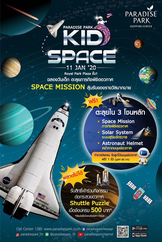 ศูนย์การค้าพาราไดซ์ พาร์ค จัดงาน “Paradise Park Kid Space” กิจกรรมสุดพิเศษเพื่อน้องๆ หนูๆ ที่จะพาทุกคนตะลุยไปกับ 3 โซนหลัก เริ่มที่โซนแรกกับ Space Mission ภารกิจพิชิตอวกาศ ทดสอบความแม่นยำในการยิงจรวดให้ไปตกที่ดวงดาวโซนที่ 2 Astronaut Helmet หน้ากากมนุษย์อวกาศ เด็กๆ จะได้เติมเต็มจินตนาการเสริมสร้างทักษะด้านศิลปะกับการประดิษฐ์หน้ากากมนุษย์อวกาศของตนเอง และโซนที่ 3 Solar System ชวนน้องๆ ฝึกการจัดเรียงลำดับดวงดาวในระบบสุริยะ เรียนรู้ระบบสุริยจักรวาลผ่านกิจกรรมเสริมทักษะ พิเศษสำหรับคุณหนูๆ ที่เข้าร่วมทุกกิจกรรมสามารถสะสมคะแนน และแสตมป์ใน Passport ครบตามกำหนดจะได้รับลูกโป่งมนุษย์อวกาศฟรี 1 สิทธิ์ นอกจากนี้ เมื่อแสดงใบเสร็จสินค้าหรือร้านอาหาร มูลค่า 500 บาท สามารถเข้าร่วมกิจกรรมต่อกระสวยอวกาศ Shuttle Puzzle ทันที 1 สิทธิ์ ในวันเสาร์ที่11 ม.ค. เวลา 10.30-19.00 น. ที่ชั้น 1 ลานรอยัลพาร์คพลาซาศูนย์การค้าพาราไดซ์ พาร์ค สอบถามโทร.02-7801429,091-7359763, 1285