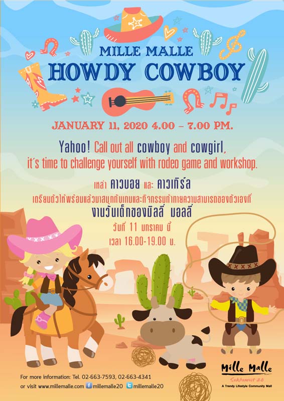 ศูนย์การค้ามิลลี่ มอลลี่ สุขุมวิท 20จัดงาน “Mille Malle Howdy Cowboy” ชวนรุ่นจิ๋วตะลุยดินแดนคาวบอย โดยได้จำลองบรรยากาศของดินแดนคาวบอยขนาดย่อมมาไว้กลางศูนย์การค้าให้น้องๆ หนูๆ ได้เพลิดเพลินและสนุกสนานกับเกมลับสมองท้าดวล เพื่อชิงของรางวัลมากมายภายในงาน อาทิ เกมทดสอบความแม่นยำไปกับเจ้ากระบองเพชรน้อย Cactus Ring Toss, เกมโยนบ่วงคล้องม้า Horse Hunting และเกมทรงตัวบนวัวกระทิงจอมพยศ CowboyRiding พลาดไม่ได้กับกิจกรรมเวิร์กช็อปประดิษฐ์ซองใส่ปืนสไตล์คาวบอย ให้เด็กๆ ได้มาโชว์ไอเดียตกแต่งเก๋ๆ กันอีกด้วย กิจกรรมฟรีตลอดงานในวันเสาร์ที่ 11 ม.ค. เวลา 16.00-19.00 น.ที่ลานกิจกรรม ศูนย์การค้ามิลลี่ มอลลี่ สุขุมวิท 20สอบถามโทร.02-6637593