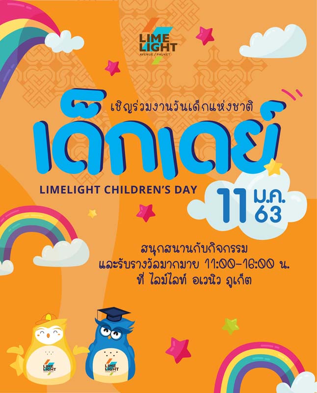 ศูนย์การค้าไลม์ไลท์ อเวนิว ภูเก็ต จัดงาน“Limelight Children’s Day” เต็มอิ่มด้วยกิจกรรมสำหรับน้องๆ หนูๆ มากมาย ตั้งแต่ระบายสีวาดรูป กับสถาบันต่างๆ อาทิ Hands on Art Studio, Artino School of Creative Art, Phuket Kids Model พันธมิตรร่วมสร้างความสนุก ได้แก่ S.U.Suzuki Phuket, Excon Pro, ไร่วานิช,ร้านหนังสือเส้งโห มาสนุกสนานกับดีเจแมน-ธนรัตน์กิตยาการ ขวัญใจของน้องๆ หนูๆ จะมาชวนน้องๆ เล่นเกม ทำกิจกรรม รับของขวัญของรางวัลมากมายไม่ว่าจะเป็นบัตรสวนน้ำ Splash Jungle บัตรชมการแสดงโชว์โลมาภูเก็ต อุปกรณ์การเรียน พบกับความสามารถของน้องๆ หนูๆ ที่จะมาวาดลวดลายทั้งร้องทั้งเต้นจาก KPN, Yamaha, ดราก้อนยิมเทควันโด, Danz Step by ครูอ้อน, South Timez academy of performing arts, Innergy Arts of Dance Studio และ Phuket Kids Model พร้อมพบกับแกะ และพี่หมูฮ้องวัวจิ๋ว ขวัญใจเด็กๆ จากไร่วานิชที่มาร่วมเล่นกับเด็กๆ ในวันเสาร์ที่ 11 ม.ค. เวลา 11.00-16.00 น.ที่ลานกิจกรรม ชั้น 1 และบริเวณไลม์ไลท์การ์เด้นท์ไลม์ไลท์ อเวนิว ภูเก็ต ถนนดีบุก สอบถามโทร.076-682900