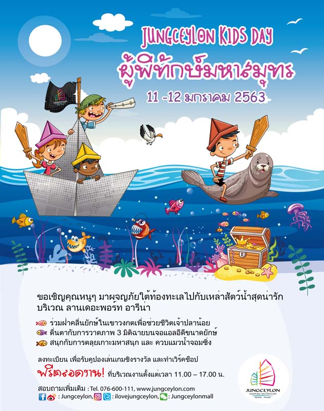 ศูนย์การค้าจังซีลอน ป่าตอง ภูเก็ต จัดงาน “Jungceylon Kids Day 2020” ตอนผู้พิทักษ์มหาสมุทร เชิญชวนน้องๆ หนูๆ มาร่วมผจญภัยในดินแดนมหาสมุทรจำลองที่เต็มไปด้วยเหล่าตัวการ์ตูนสัตว์ทะเลมากมาย อาทิ ตื่นตาตื่นใจไปกับ Ken Octopus เจ้าปลาหมึกยักษ์ กับขนาดความสูงกว่า 5 เมตร ที่พกพาบรรดาเพื่อนสัตว์ทะเลนานาชนิดมาให้น้องๆ ได้ร่วมสนุกและผจญภัยไปในกิจกรรมต่างๆ อาทิ สนุกไปกับ Sea Maze เกมฝ่าคลื่นยักษ์ในเขาวงกต เพื่อช่วยชีวิตเจ้าปลาตัวน้อย, เกมควบเจ้าแมวน้ำจอมซิ่ง, เกมตะลุยเกาะมหาสนุก และกิจกรรมไฮไลท์ภายในงานกับกิจกรรมเวิร์กช็อปวาดภาพ สัตว์ในมหาสมุทรของฉัน ที่น้องๆ จะได้ร่วมวาดภาพสัตว์ทะเลต่างๆ ตามจินตนาการของตนเอง พร้อมส่งเจ้าสัตว์ทะเลตัวน้อยใหญ่เหล่านั้นขึ้นสู่จอ LED ขนาดยักษ์ ให้ได้แหวกว่ายในรูปแบบของภาพวาด 3 มิติ สร้างความประทับใจ และความภาคภูมิใจให้น้องๆ ได้ถ่ายภาพคู่กับผลงานได้อีกด้วย กิจกรรมฟรีตลอดงาน ระหว่างวันที่ 11-12 ม.ค. เวลา 11.00-17.00 น.ที่ลานเดอะพอร์ท อารีน่า ศูนย์การค้าจังซีลอน ป่าตอง ภูเก็ต สอบถามโทร.076-600111