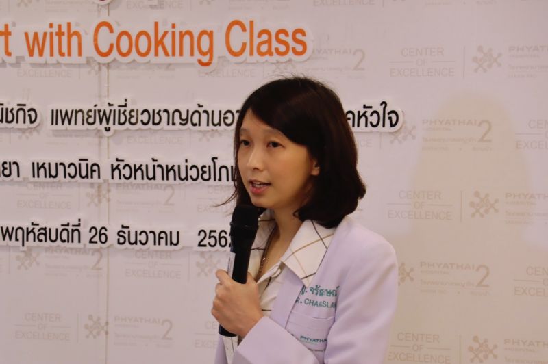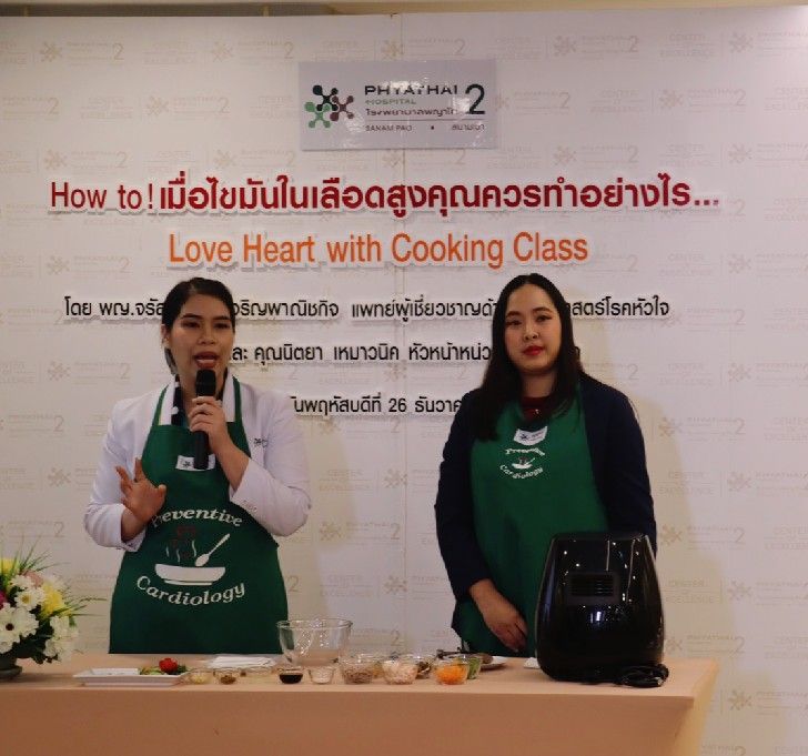 ด้านแพทย์หญิงจรัสลักษณ์ เจริญพาญิชกิจ แพทย์ผู้เชี่ยวชาญด้านอายุรศาสตร์โรคหัวใจ ระบุว่า วิธีง่าย ๆ ที่สามารถช่วยลดปัญหาโรคไขมันในเลือดสูง ด้วยการเปลี่ยนอาหารจานธรรมดา ให้เป็น 2 ต่อ 1 ต่อ 1 คืออาหาร 1 จาน ขอให้มี ข้าว 1 ส่วน เนื้อ 1 ส่วน และผัก 2 ส่วน รวมถึงการออกกำลังอย่างสม่ำเสมอและเพียงพอ ก็จะสามารถป้องกันและลดโรคได้ ทั้งนี้ภายงานยังมี Cooking class จากนักโภชนบำบัด ทำอาหารสุขภาพตัวอย่างด้วยวัตถุดิบหาง่าย เช่น เห็ด ให้ผู้ป่วยได้รับประทานอีกด้วย
