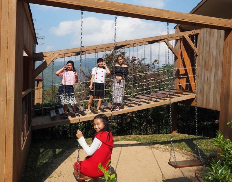 เริ่มที่กิจกรรมแรกที่เด็กคนไหนมาต้องไปเช็คอิน…ฟินให้สุด นั่นคือ สนามเด็กเล่นไม้ (DoiTung Playground) ที่เป็นมากกว่าของเล่นเด็ก เพราะนอกจากจะได้เพลิดเพลินและเสริมทักษะด้านประสาทสัมผัสและร่างกายในการปืนป่าย อาทิ สไลเดอร์, กิจกรรมแอดเวนเจอร์อย่าง มินิซิปไลน์สำหรับคุณหนู, ปีนผาจำลองไซส์มินิ, ไต่สะพานเชือก เป็นต้น เด็กๆ ยังเหมือนได้ออกกำลังกายท่ามกลางอากาศที่บริสุทธิ์ และชมวิวที่ตั้งของสนามเด็กเล่น ยังมองเห็นวิวทิวเขาน้อยใหญ่ สลับกับดอกไม้ที่อยู่ในบริเวณสวนแม่ฟ้าหลวง จนนักท่องเที่ยวรุ่นเยาว์ต่างยกให้เป็นสนามเด็กเล่นที่สวยที่สุดในเมืองไทย