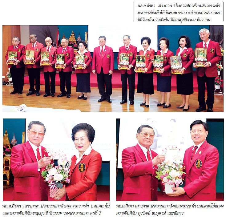 มาคมสภาสังคมสงเคราะห์ฯ ได้มีการเปลี่ยนแปลงคณะกรรมการของสมาคมสภาสังคมสงเคราะห์ สมัย 2560-2563 ตามมติที่ประชุมคณะกรรมการอำนวยการสมาคมฯ โดย พลเอกสิงหา เสาวภาพ ประธานสภาสังคมสงเคราะห์แห่งประเทศไทย ในพระบรมราชูปถัมภ์ มอบดอกไม้แสดงความยินดีกับ แพทย์หญิงสุวณี รักธรรม รองประธานสภาสังคมสงเคราะห์ฯ ที่ได้รับคัดเลือกเป็นกรรมการผู้ทรงคุณวุฒิในคณะกรรมการผู้สูงอายุแห่งชาติ (ด้านสุขภาพ) พร้อมร่วมแสดงความยินดีกับ สุรวัฒน์ ชมพูพงษ์ ที่ได้รับการแต่งตั้งเป็นเลขาธิการสภาสังคมสงเคราะห์ และได้รับการประกาศเกียรติคุณผู้ทำคุณประโยชน์ด้านแรงงาน ประจำปี 2562 รวมทั้ง จารุนันท์ อึ้งภากรณ์ รองเลขาธิการสภาสังคมสงเคราะห์ฯ ได้รับการแต่งตั้งเป็นรองประธานคณะอนุกรรมาธิการปฏิรูปสังคมด้านผู้สูงอายุ วุฒิสภา นอกจากนี้พลเอก สิงหา เสาวภาพ ประธาน สภาสังคมสงเคราะห์ฯ ยังได้มอบของที่ระลึกให้กับคณะกรรมการอำนวยการสมาคมฯ ที่มีวันคล้ายวันเกิดในเดือนพฤศจิกายน-ธันวาคม เมื่อวันที่ 19 ธันวาคม 2562
