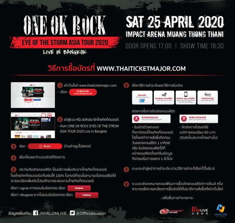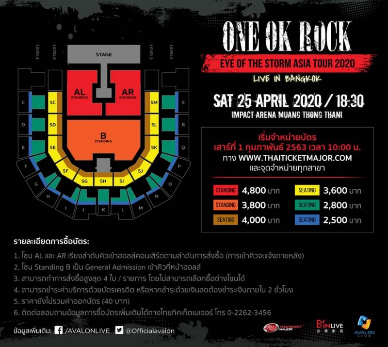 ปี 2020 นี้ แฟนๆ ชาวไทยเตรียมกรี๊ด กันให้สุดเสียง และไปร็อกกันให้สุดเหวี่ยง ในคอนเสิร์ตครั้งยิ่งใหญ่ของพวกเขา กับ ONE OK ROCK “EYE OF THE STORM ASIA TOUR 2020” LIVE IN BANGKOK เสาร์ที่ 25 เมษายน 2020 ณ อิมแพค อารีน่า เมืองทองธานี บัตรราคา 4,800, 4,000, 3,800, 3,600, 2,800 และ 2,500 บาท จำหน่ายบัตรพร้อมกัน ในวันเสาร์ที่ 1 กุมภาพันธ์ 2020 ทาง www.thaiticketmajor.com/ และจุดจำหน่ายบัตร ของไทยทิคเก็ตเมเจอร์ทุกสาขา งานนี้อาวาลอน ไลฟ์ จัดหนักจัดเต็ม ขนเครื่องดนตรี เวที และโปรดักชั่นเต็มรูปแบบมาให้แฟนๆ ชาวไทยได้เต็มอิ่มกันอย่างแน่นอน ติดตามรายละเอียดเพิ่มเติมทาง Facebook.com/AVALONLIVE และ Twitter @OfficialAvalon