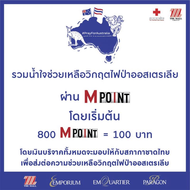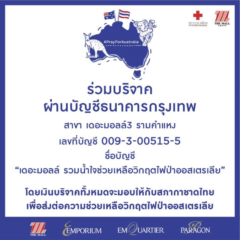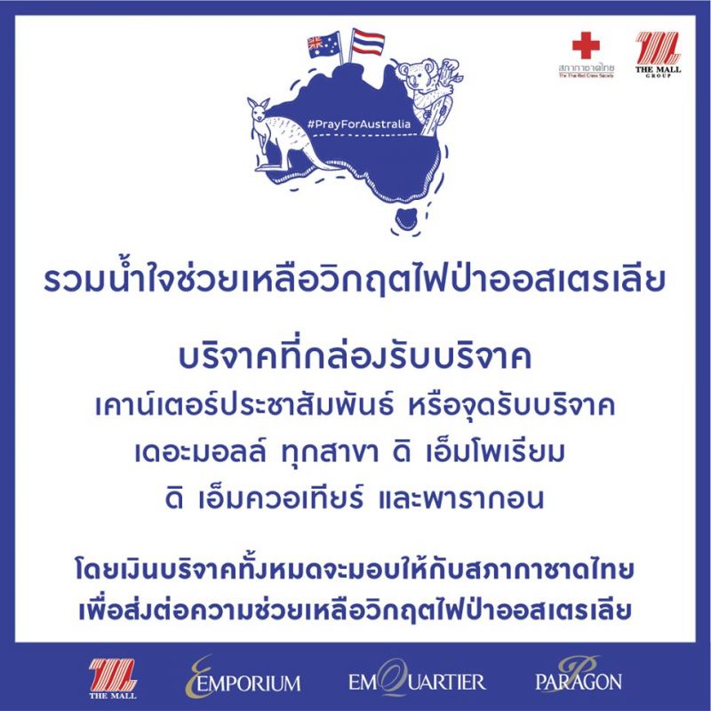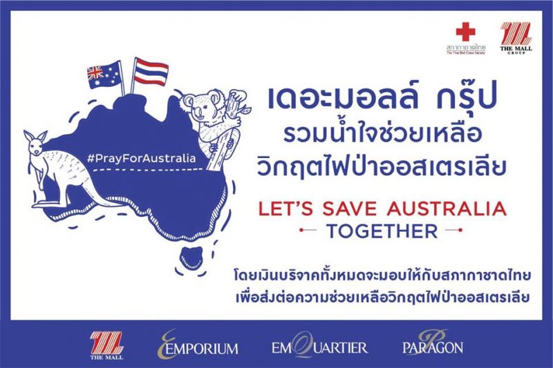 บริษัท เดอะมอลล์ กรุ๊ป จำกัด จัดโครงการ “เดอะมอลล์ รวมน้ำใจช่วยเหลือวิกฤตไฟป่าออสเตรเลีย” เชิญชวนลูกค้า และพนักงาน ร่วมบริจาคสมทบทุนเพื่อช่วยเหลือประชาชนออสเตรเลียที่ได้รับผลกระทบจากเหตุการณ์ไฟป่า รวมถึงหน่วยงานต่างๆ ที่กำลังเร่งดับไฟ และฟื้นฟูสภาพป่าและสัตว์ป่า โดยเงินบริจาคทั้งหมดมอบผ่านสภากาชาดไทย