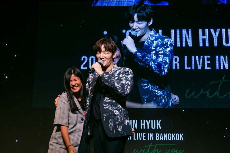 เสียงกรี๊ดดังสนั่นทันทีที่ “ชเว จินฮยอก” ปรากฏตัวพร้อมเพลง I’m Saying เพลงประกอบซีรีส์เรื่อง The Heirs ที่เขาร่วมแสดง ในลุคหล่อทำลายล้าง แฟนๆ ใจบางกันทั้งฮอลล์ จากนั้นโอปป้ารีบทักทายทุกคนพร้อมส่งรอยยิ้มทันที จากนั้นเข้าสู่ช่วงทำความรู้จักกันให้มากขึ้น โอปป้าเล่าถึงการทำงานตลอด 15 ปีในวงการ และไลฟ์สไตล์ของตัวเอง มาหมดทุกฟิลลิ่ง ทั้งอ่อย ทั้งหยอดจนไม่ไหวจะรัก