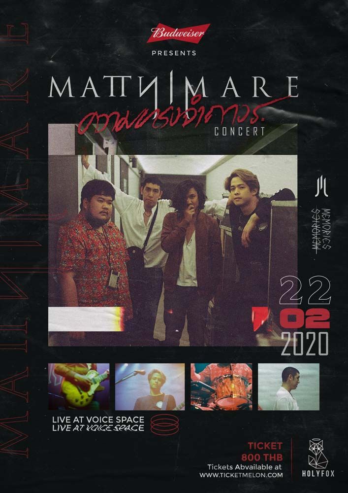 วง Mattnimare (แมทนิแมร์) ที่ได้รับการตอบรับเป็นอย่างดีซิงเกิ้ลแรกและซิงเกิ้ลสุดท้ายที่ทั้ง 4 หนุ่มร่วมงานกันภายใต้สังกัดHolyFox ดูแลโดย LOVEiS ENTERTAINMENT ด้วยเพราะแต่ละคนมีมุมมองและทิศทางการทำดนตรีที่แตกต่างกัน ดังนั้นหลังจบโปรเจกท์นี้แต่ละคนก็จะแยกย้ายกันไปทำงานเพลงตามแนวทางของตัวเองซึ่งเป็นที่น่าเสียดายมาก HolyFox ต้นสังกัดประกาศขอร่วมเดินทางครั้งสุดท้ายกับพวกเขาด้วยการจัดคอนเสิร์ตครั้งแรกและครั้งสุดท้ายที่อยากจะชวนทุกคนมาร่วมสร้างความทรงจำไปด้วยกัน คอนเสิร์ต “Budweiser Presents MATTNIMARE ความทรงจำถาวรคืนวันที่ 22 ของเดือนกุมภาพันธ์” เปิดโชว์ในวันเสาร์ที่ 22 กุมภาพันธ์ 2563 at Voice Space เริ่มขายบัตรวันเสาร์ที่ 11 มกราคม2563 ตั้งแต่เวลา 10.00 น. บัตรราคา 800 บาทซื้อบัตได้ที่ www.ticketmelon.com ติดตามรายละเอียดเพิ่มเติมได้ที่ FB Fan Page: Mattnimare/HolyFoxInstagram: holyfox_records