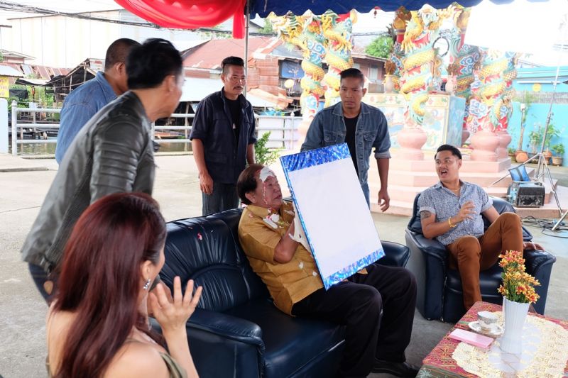 ทีมงานเซ็ทถ่ายฉากแรก เป็นฉากที่ ลุงอ้วน กำลังแจกทานให้ชาวบ้าน โดยมี อรนุช, อุบล, กาเหว่า, ยายแต๋ว และแก๊งนก รวมทั้งนักแสดงสมทบที่เล่นเป็นชาวบ้านพากันเข้าฉากอีกเพียบ เพื่อรอรับของ โดยมีเด็กๆ แก๊งนก สร้างความสนุกสนานด้วยการเต้น เพื่อขอทิปจากลุงอ้วน