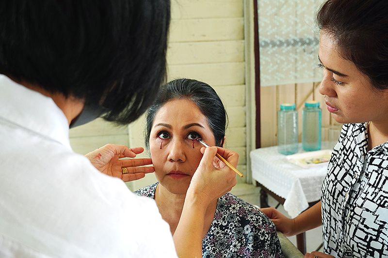 “วาสนา” เผยว่า “เป็นครั้งแรกของชีวิตการแสดง 40 กว่าปีเลยที่ได้แต่งหน้าเป็นวิญญาณ ตอนแรกแอบกลัวอยู่เหมือนกัน บอกผู้กำกับว่าขอแบบไม่เละไม่เป็นผีน่ากลัวนะ เพราะกลัวตัวเองด้วยแต่พอแต่งออกมาแล้วก็โอเค แปลกตาดีคือในเรื่องเราเป็นย่าของนางเอก แล้วนางเอกต้องจินตนาการว่า เรามีเลือดไหลออกตา ย่าของเค้ากำลังตกอยู่ในอันตรายแต่จริงๆ แล้วนี่คือวิญญาณทำให้เห็นภาพแบบนี้ขึ้น”